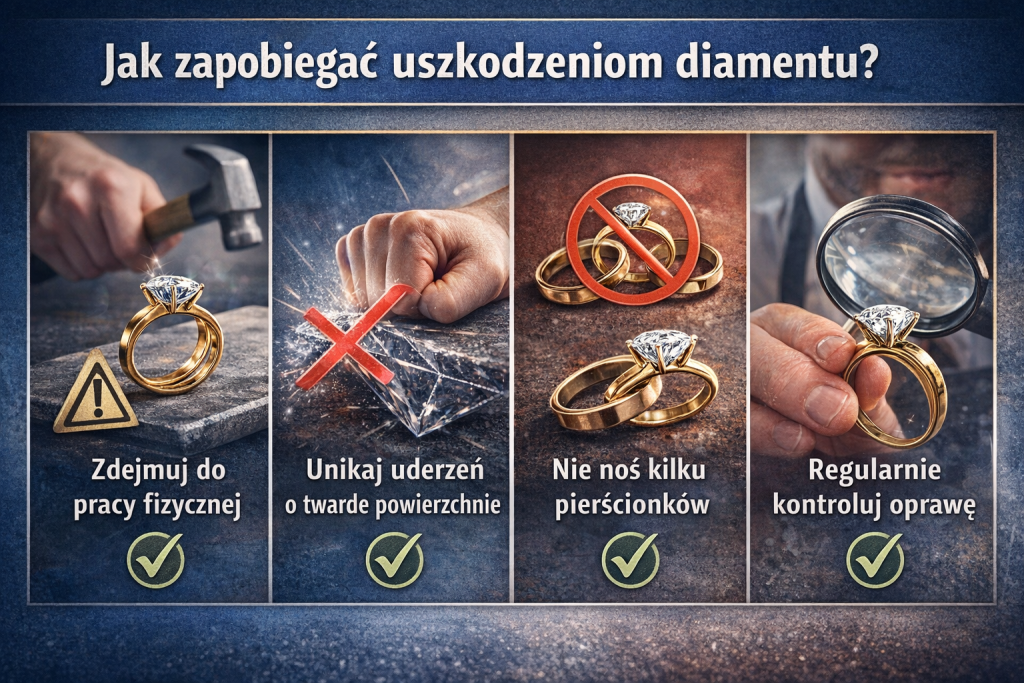 W codziennym użytkowaniu diamenty nie ulegają uszkodzeniom losowo. Potrzebne są konkretne warunki.